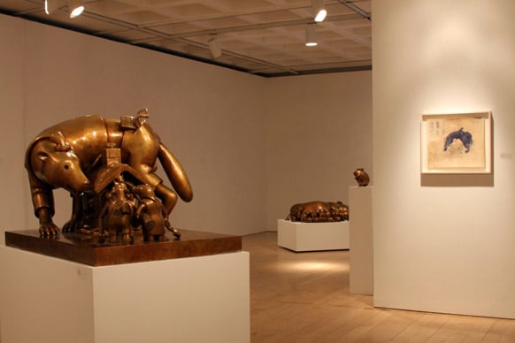 Otterness’ anthropomorphized and slyly playful figures have been internationally known for many years, but following the worldwide financial crisis of the last few years his sculptures Bear Riding Bull, Old Woman and Shoe, and Bad Wolf, a mortgage note in the wolf’s pocket while he circles the three pigs, have special resonance. We are lured into an automatic, unconscious acceptance of Otterness’ cartoon-like subjects – his undeniably cute Guinea Pigs on Fire Truck, sweetly maternal Mama Pig suckling her piglets and his regal Big Cat. We cannot help but be drawn by the seductive physical qualities of the smooth bronze forms and luscious caramel patinas of his Bear on Moneybag and Cash Cow. And yet as Moore notes in his catalogue essay accompanying the exhibition,