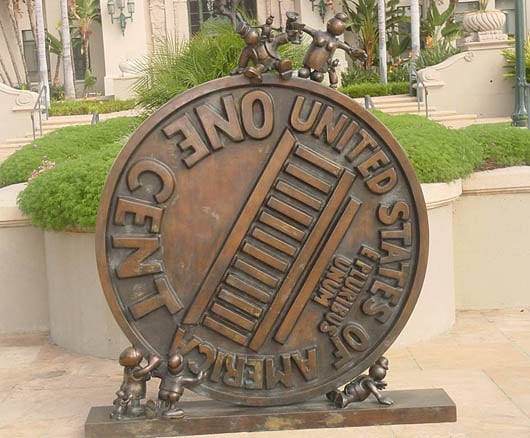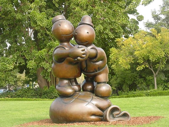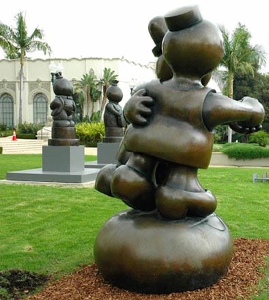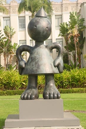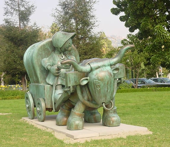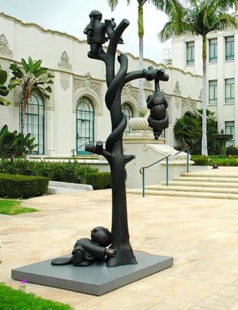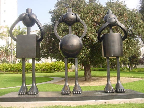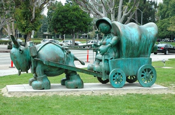Sculptures in Beverly Hills are See No Evil, Big Big Penny, Free Money, Mad Mom, King, Queen, Tree of Knowledge and Covered Wagon, Otterness’ ode to pioneer life. “It’s been fun to watch all these East Coast sculptures migrate west. Covered Wagon finally made it to the Pacific,” said the New York City-based Otterness.