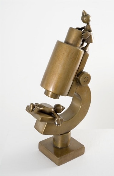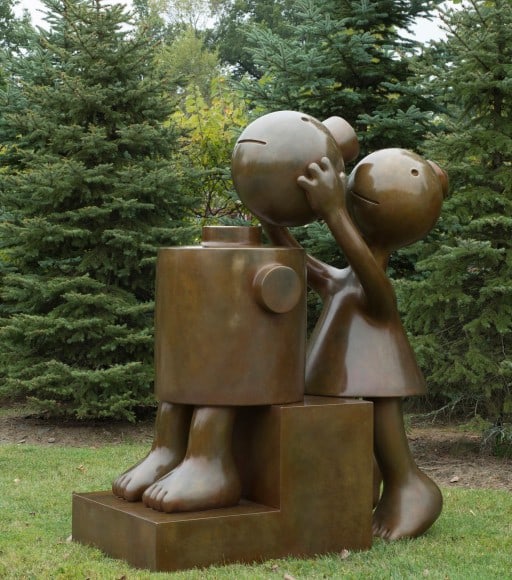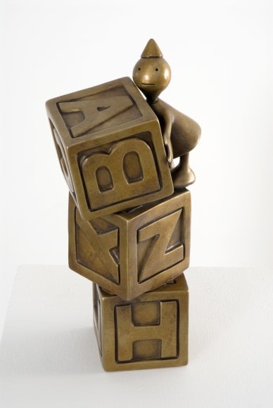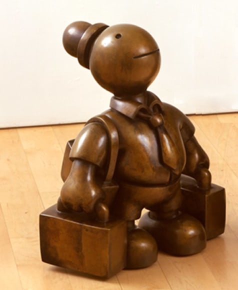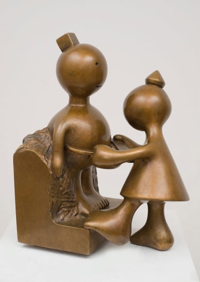 Otterness’s figures explore a spectrum of sentiments. Sad Sphere depicts a sorrowful or overwhelmed figure hunched over with his head held defeatedly between his hands. In Youth and Age, Otterness juxtaposes the tensions and relationships between young and old, placing the overinflated confidence of adolescence—Youth—opposing the diminutive stature of an elderly figure—Age. Overshadowed by the physical dominance of Youth, Age is bent over his cane, but simultaneously, Youth appears to crouch down to hear the wisdom of Age.This work is but one example of how Otterness uniquely comments on the human condition with specificity and wit.
