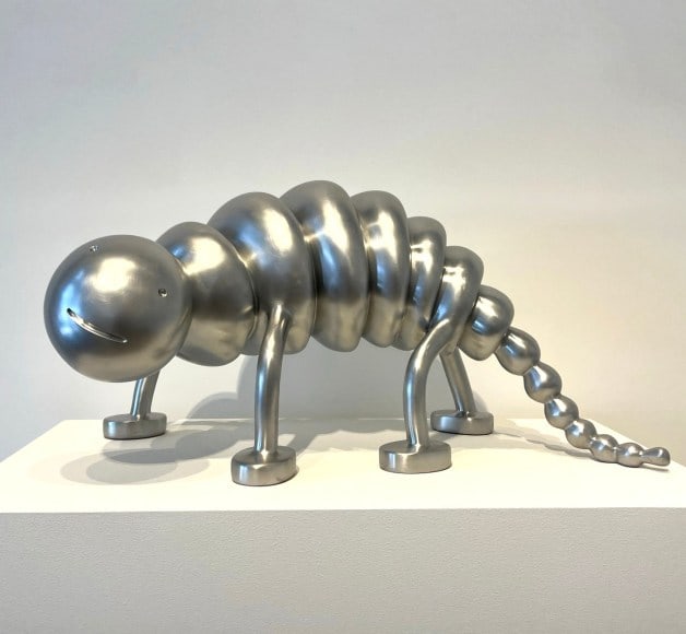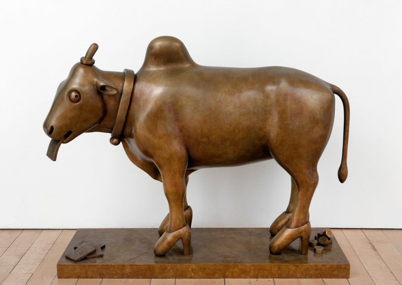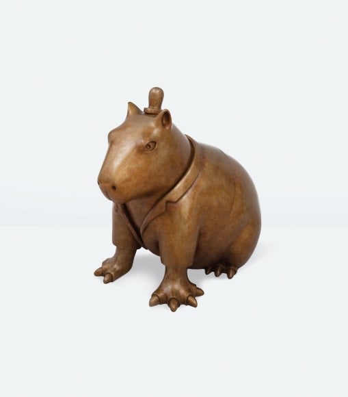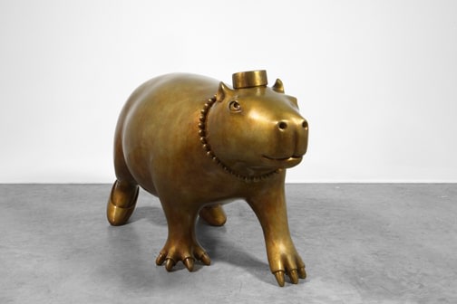 Otterness transforms bronze into comical themes and whimsical remarks on commonplace fables using his creatures as the characters—capybaras, armadillos, and cows, to name a few. The artist’s nearly life-sized bronze sculpture, Cash Cow, humorously addresses American capitalism and economics. His capybara duo plays with constructed gender identities and societal norms through their clothing and accessories—Female Capybara wears a pearl necklace and high heels, while Male Capybara wears a top hat and suit.